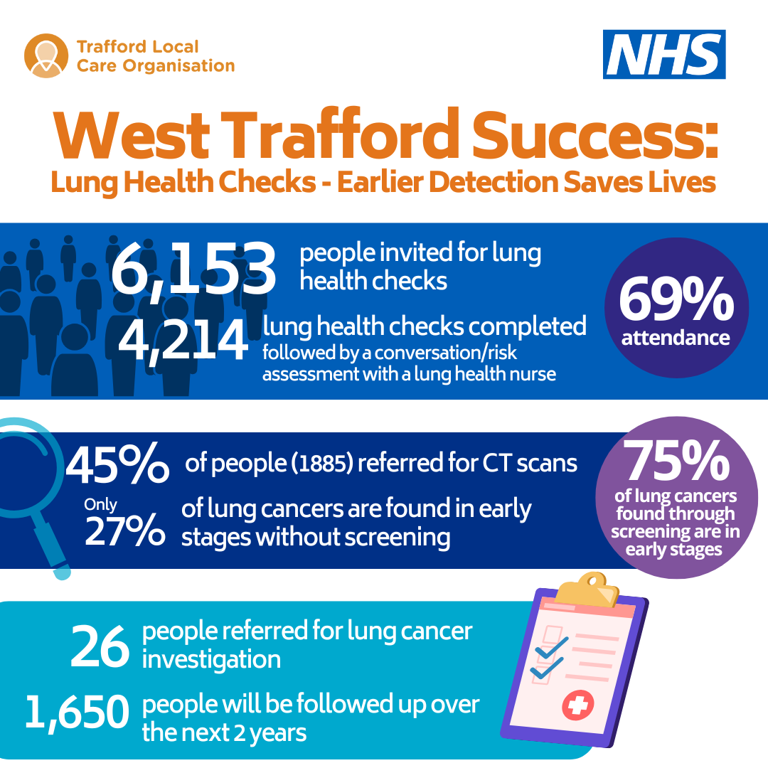 Smokers and ex-smokers aged between 55 and 74 years old are invited for an assessment and if needed, a low grade CT scan on the unit. Two sites were used, one in Partington and one in Trafford Park. Local stakeholders including primary care, community groups, the Neighbourhood and comms teams helped amplify messages and engage local people.